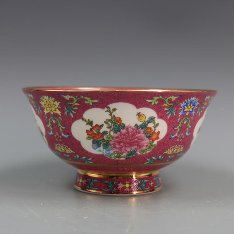 清乾隆胭脂紅地四季花紋碗仿古花紋瓷器家居裝飾擺件古董古玩收藏1入