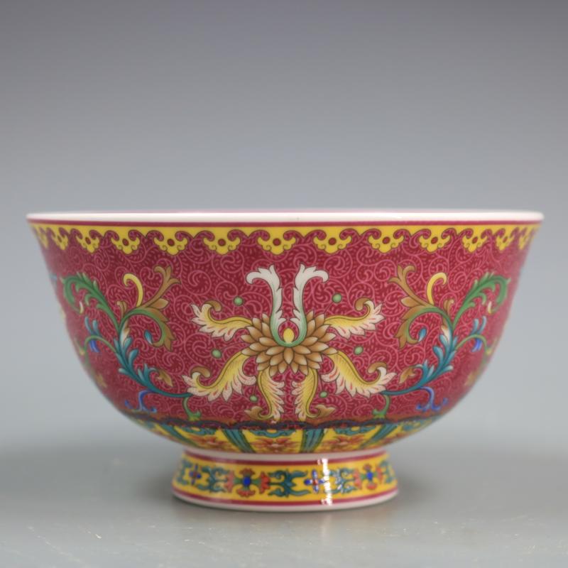 清乾隆胭脂紅地粉彩花紋碗仿古花紋瓷器家居裝飾擺件古董古玩收藏1入