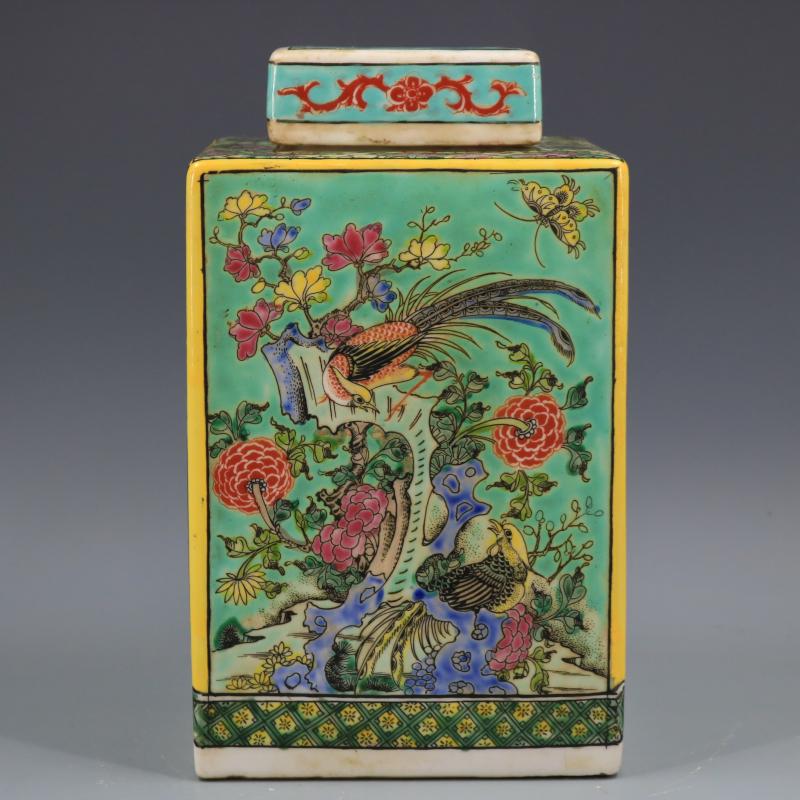 清康熙綠地粉彩人物花鳥四方茶葉罐仿古老貨瓷器家居擺件古董古玩1入