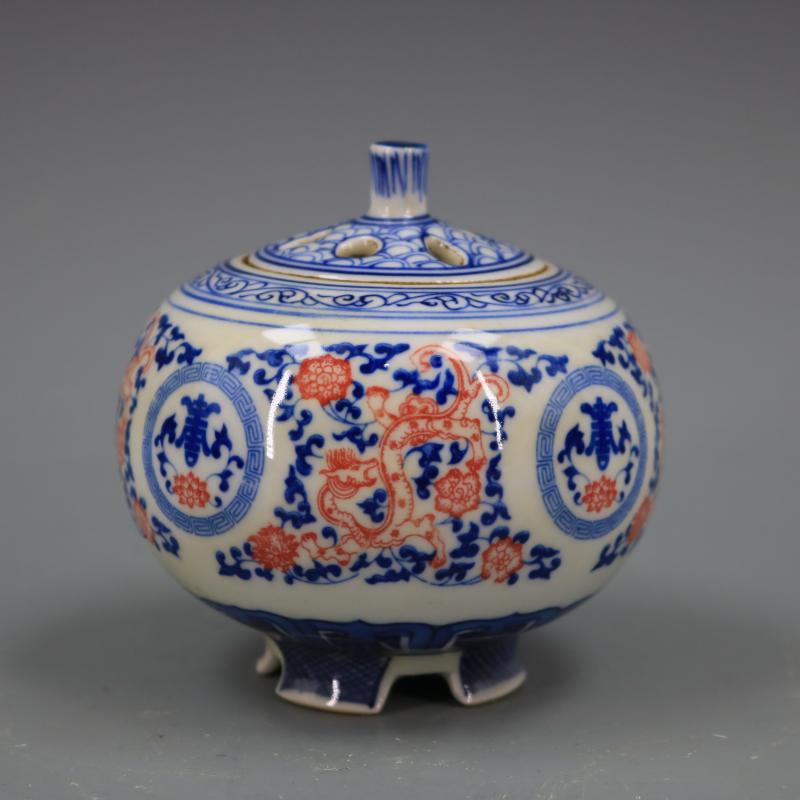 清康熙青花釉里紅草花龍壽紋香熏爐手繪仿藝瓷器家居擺件古董古玩1入