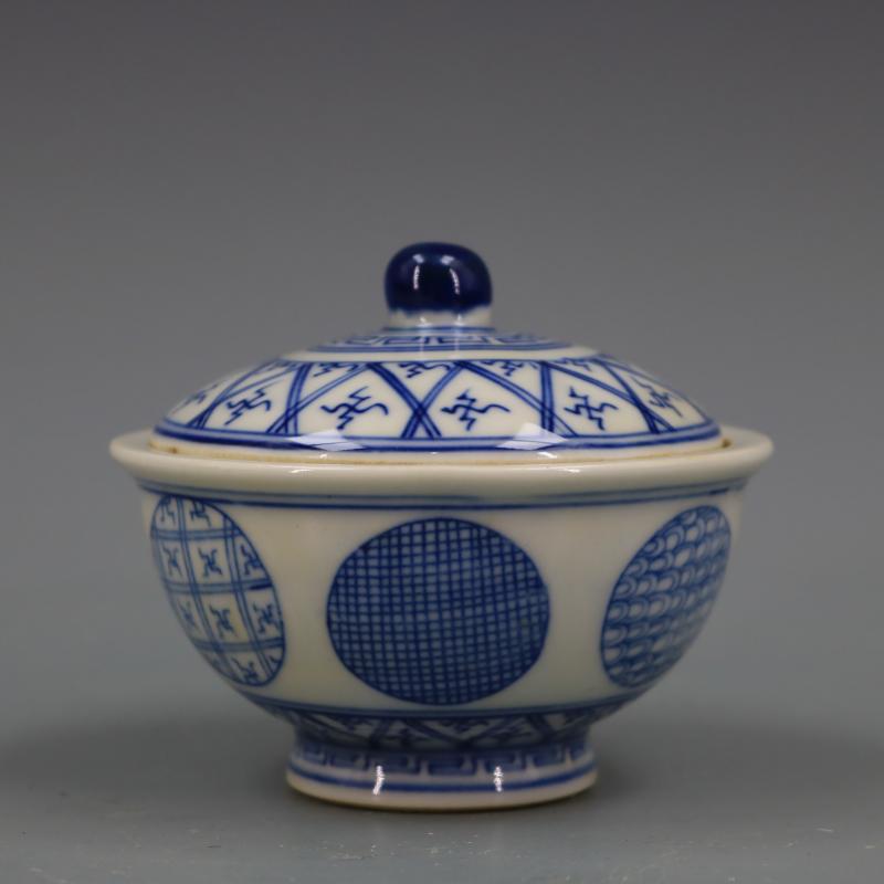 清康熙青花花紋蓋碗手繪仿古工藝品瓷器家居擺件古董古玩老貨收藏1入