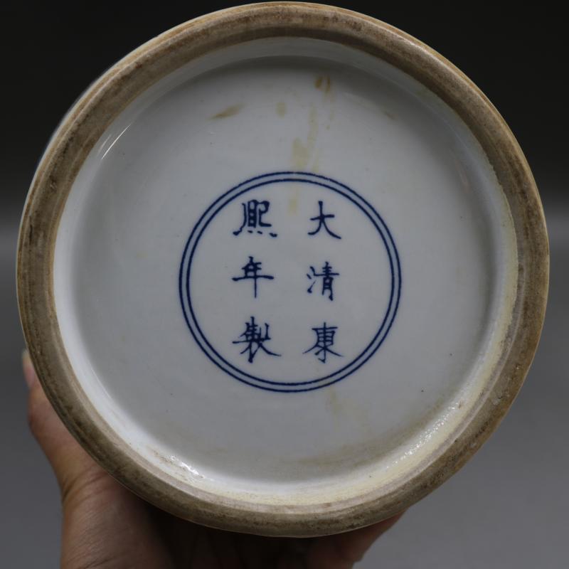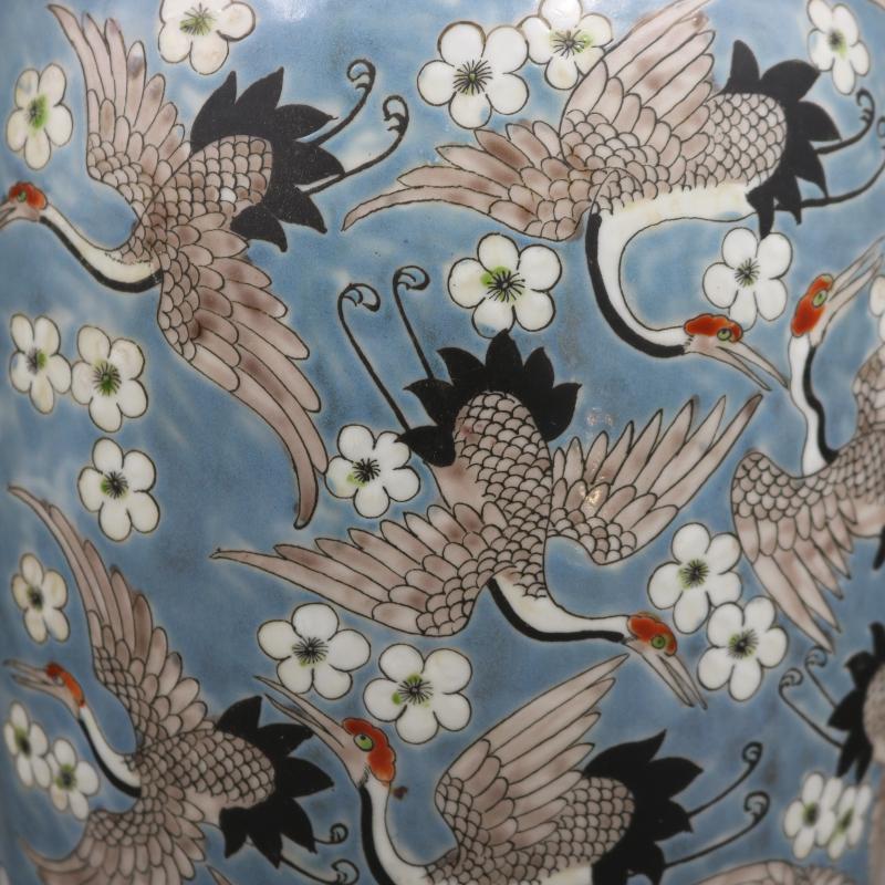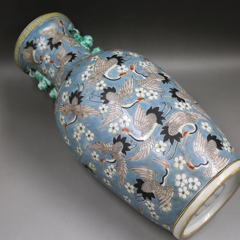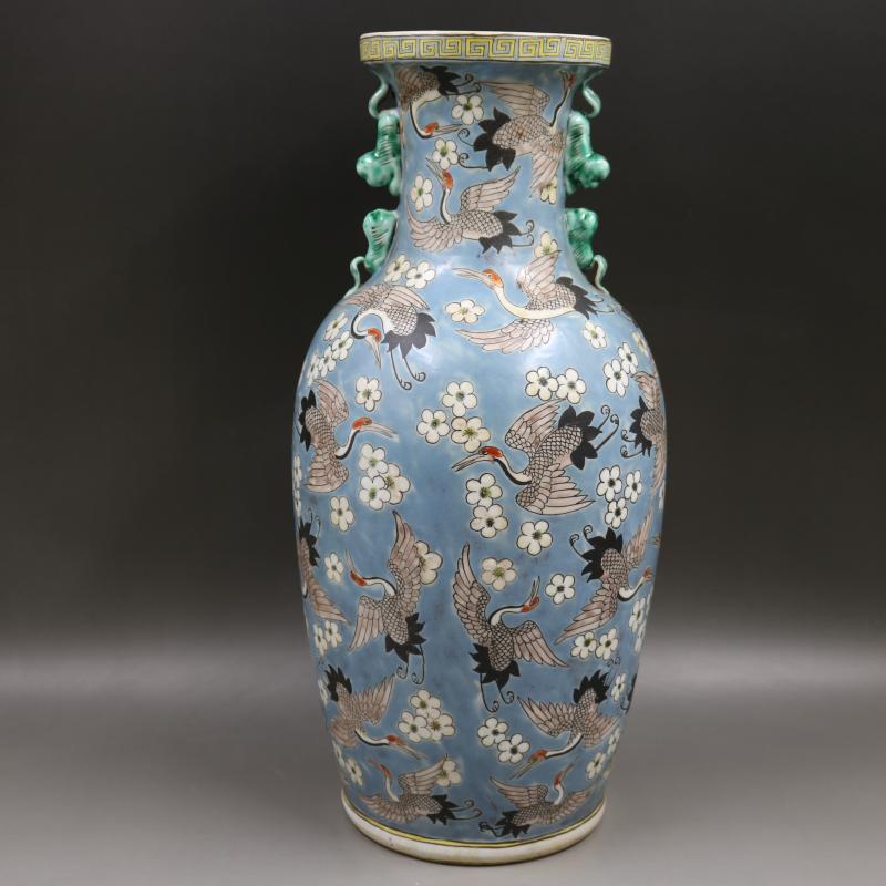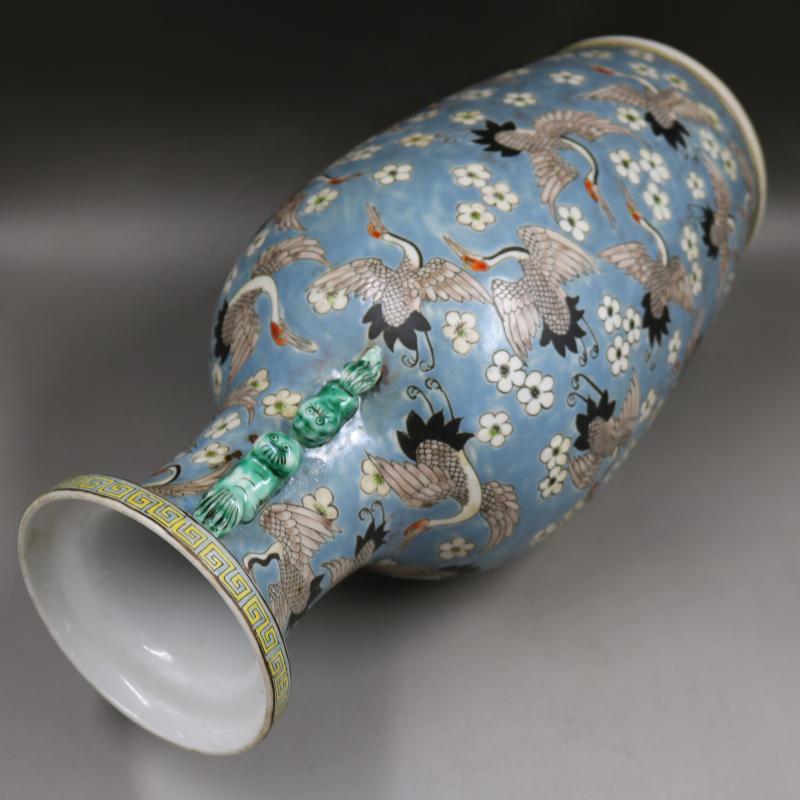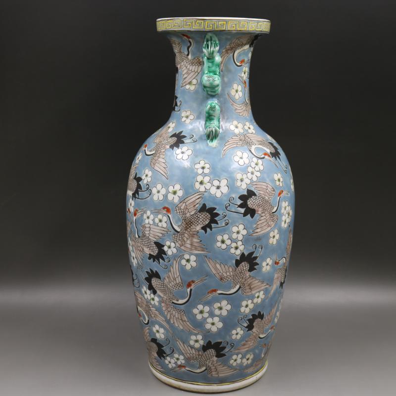 清康熙藍地皮粉彩百鶴紋獅耳瓶仿古老貨家居瓷器擺件古董古玩收藏1入