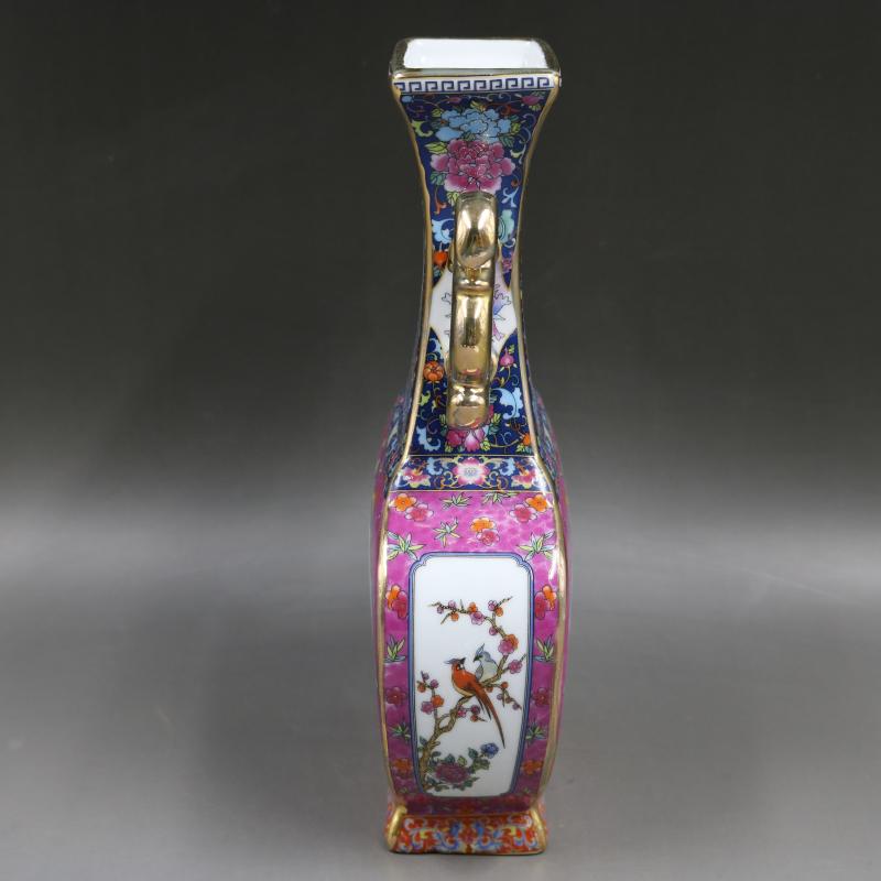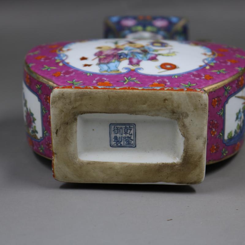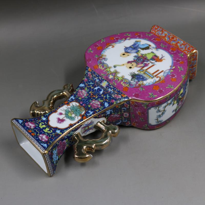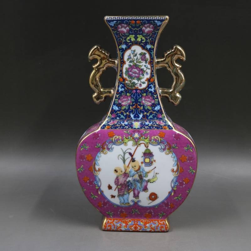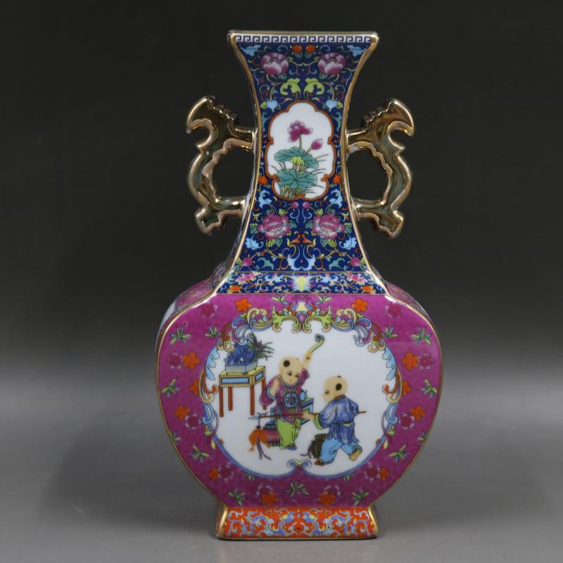 清乾隆琺瑯彩飄花嬰戲扁瓶家居復古擺件景德鎮瓷器收藏古董古玩1入
