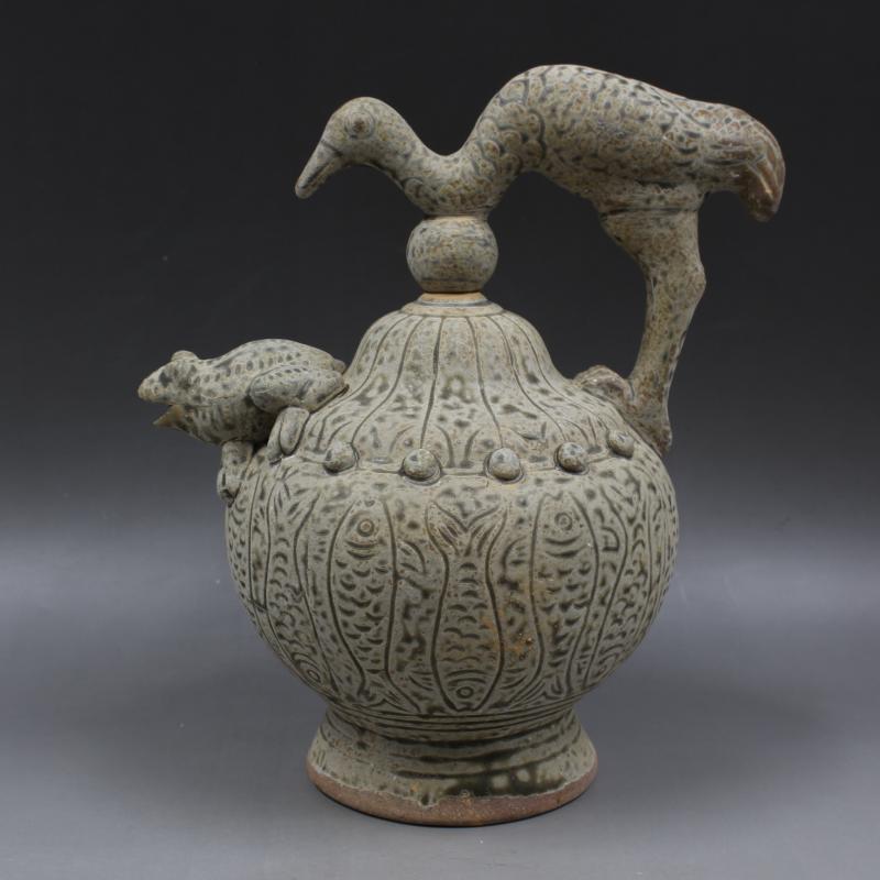 西晉越窯浮雕鶴紋倒流壺手工仿古老貨瓷器家居擺件古董古玩收藏1入