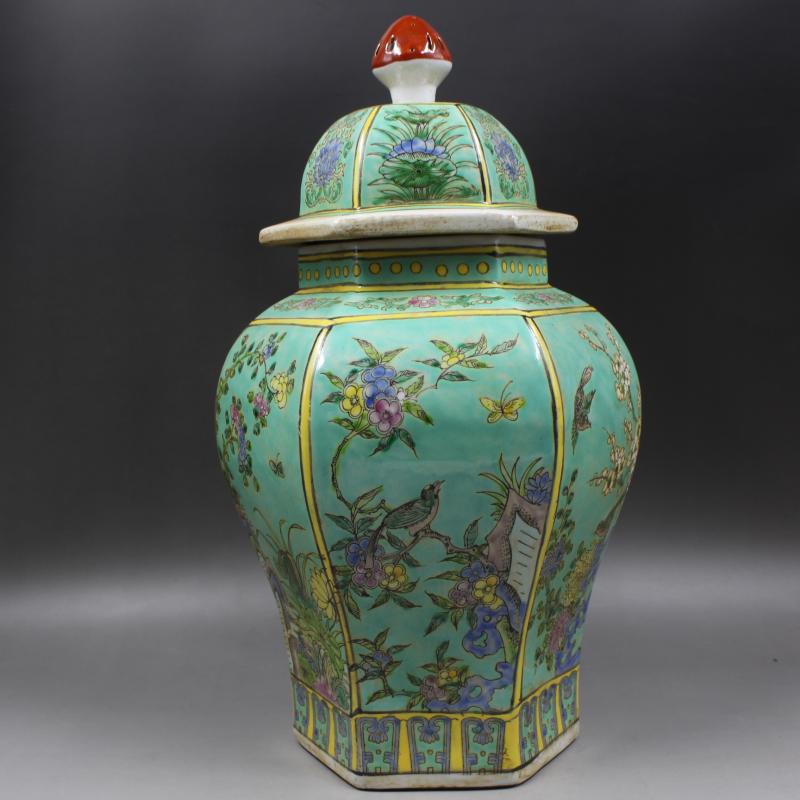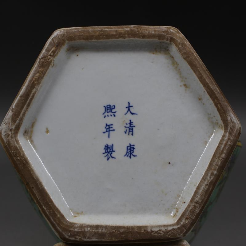 清康熙年制綠地粉彩花鳥紋六方將軍罐仿古老貨瓷器家居古玩擺件1入