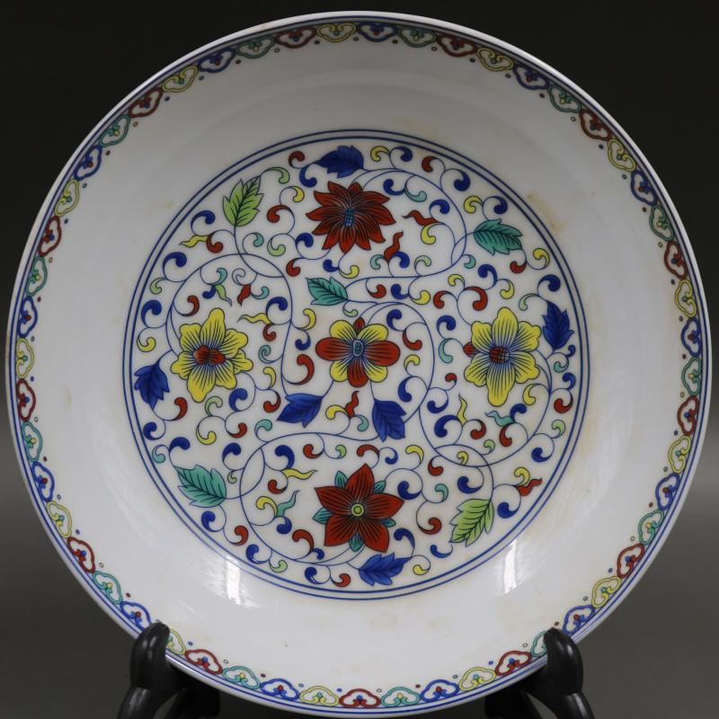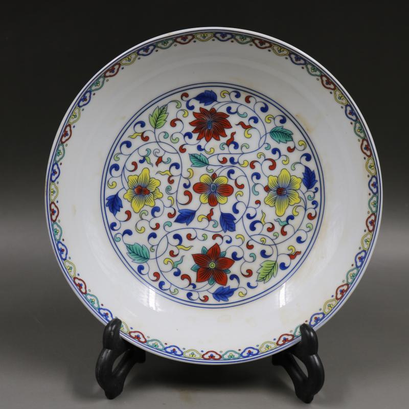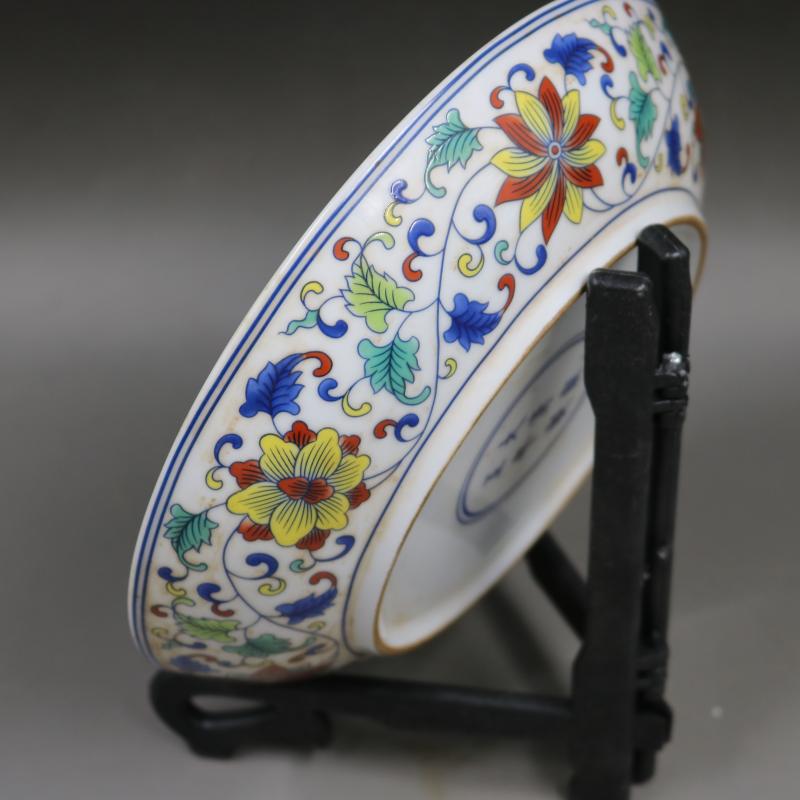 清雍正青花斗彩纏枝蓮紋盤仿古工藝品瓷器家居擺件古董古玩收藏1入