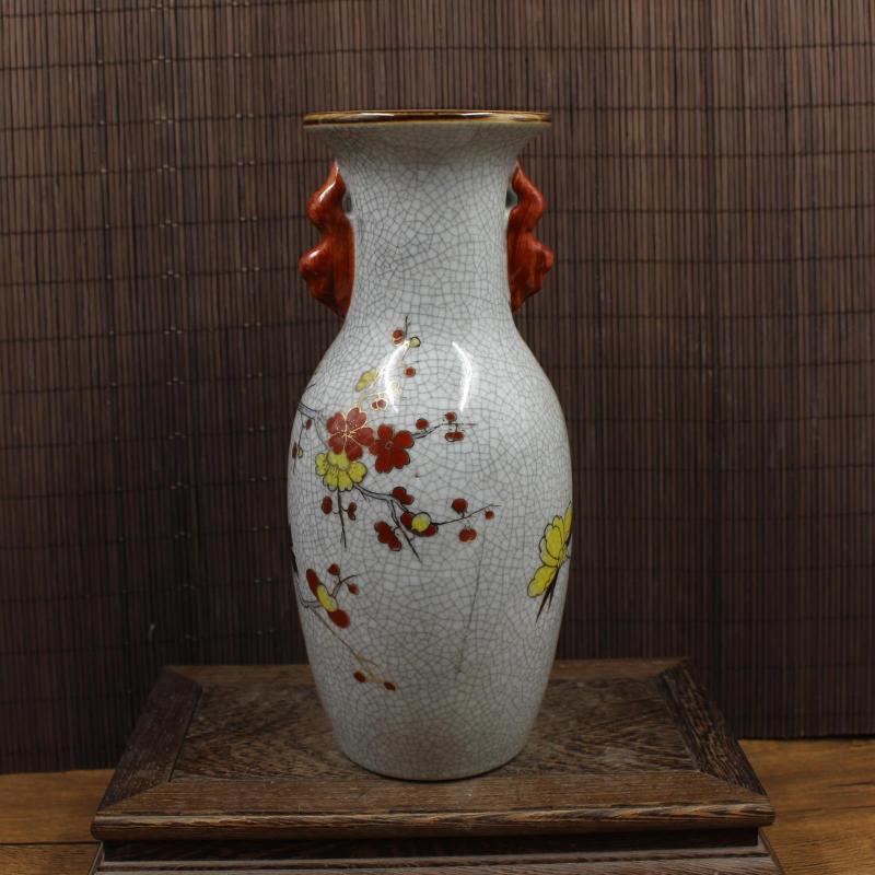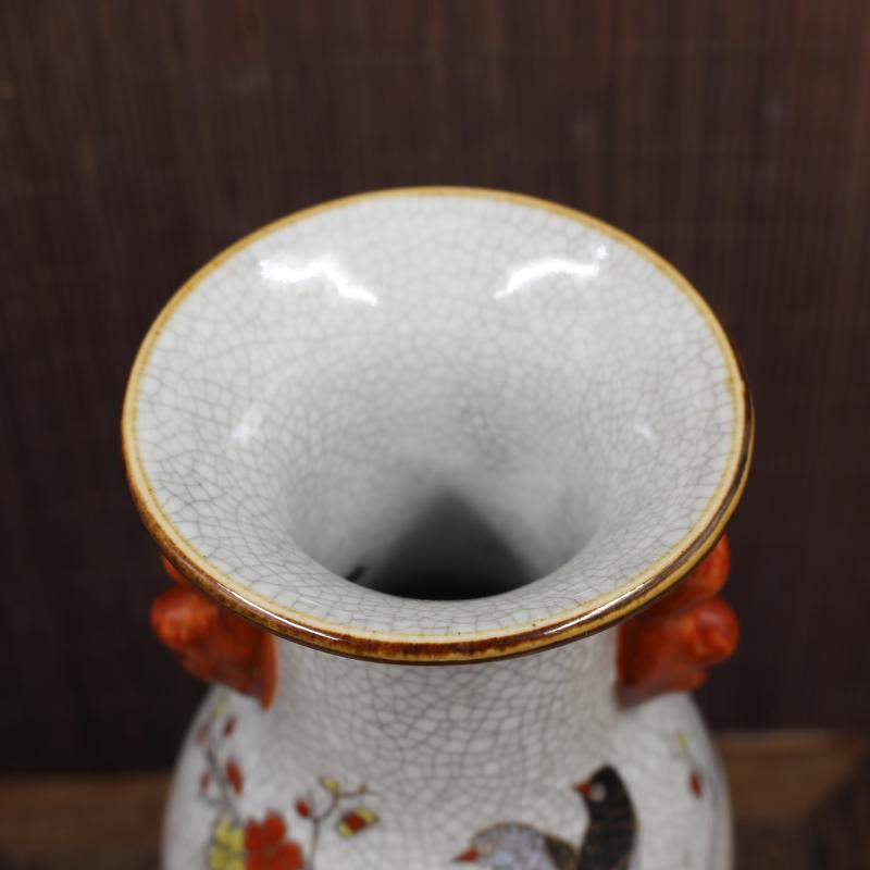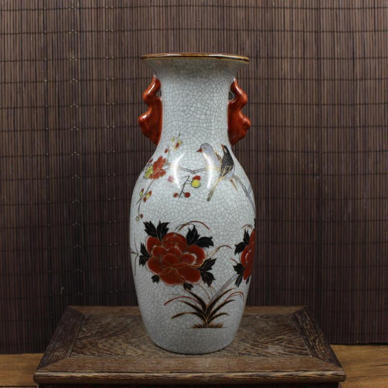 清乾隆年制粉彩描金牡丹花鳥獅耳花瓶 民間收藏老貨瓷器 古董擺件1入