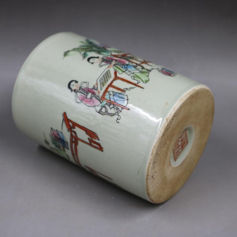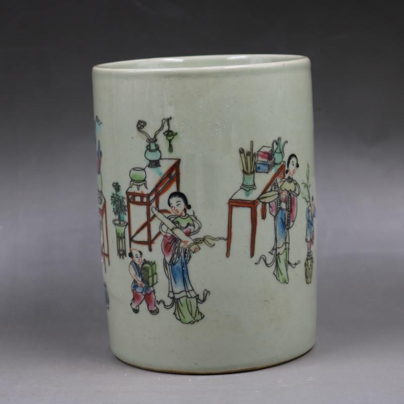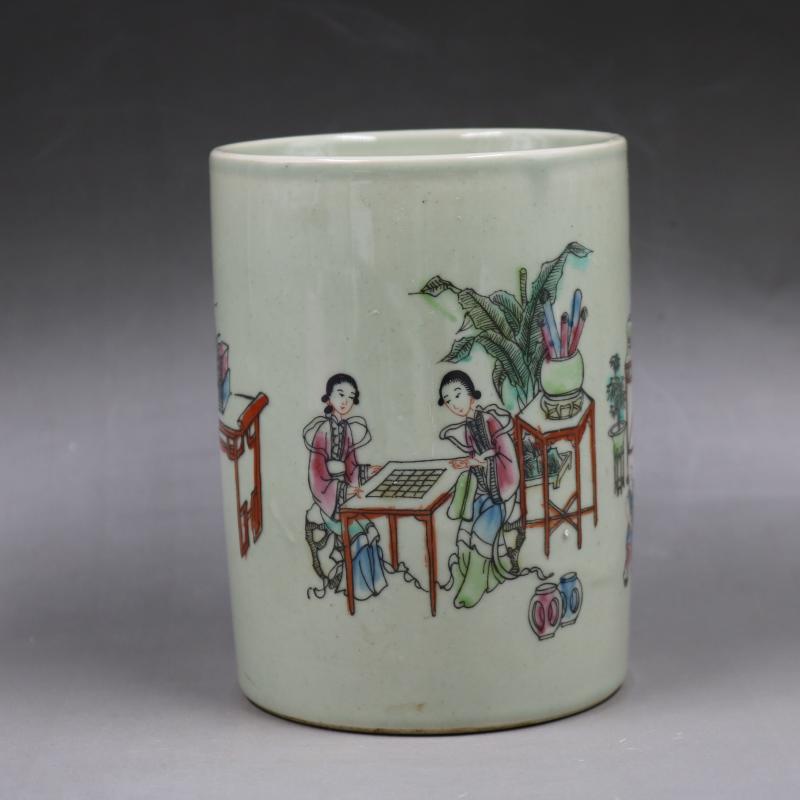 清同治粉彩人物侍女紋筆筒家居仿古裝飾文房擺件仿古瓷器古董古玩1入