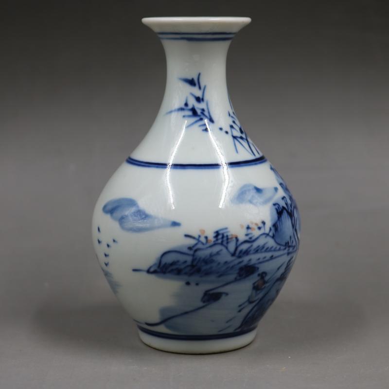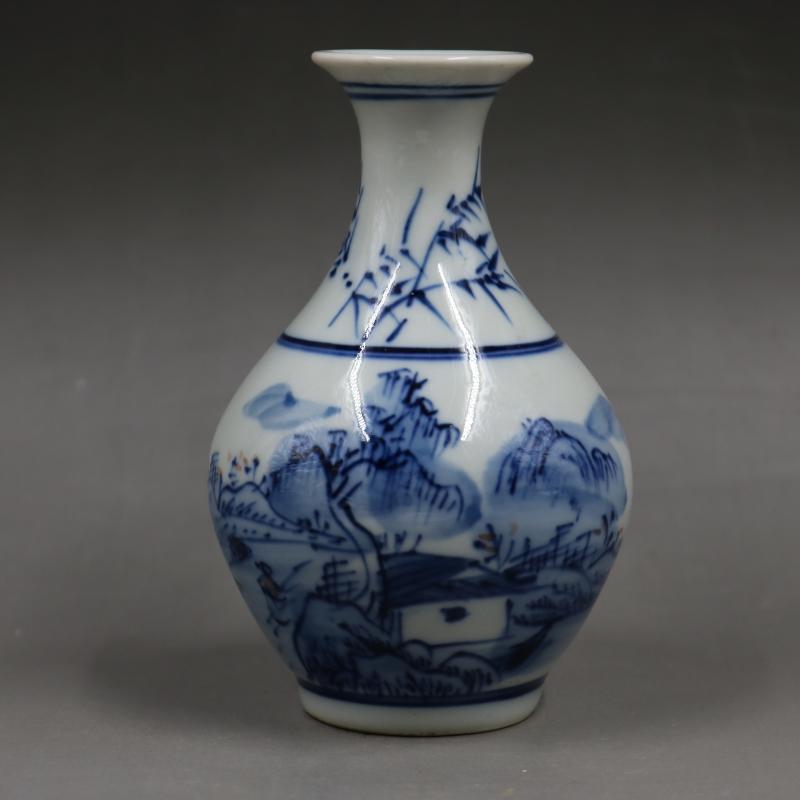 清中期青花山水玉壺春瓶全手工手繪家居裝飾擺件仿古瓷器古董古玩1入