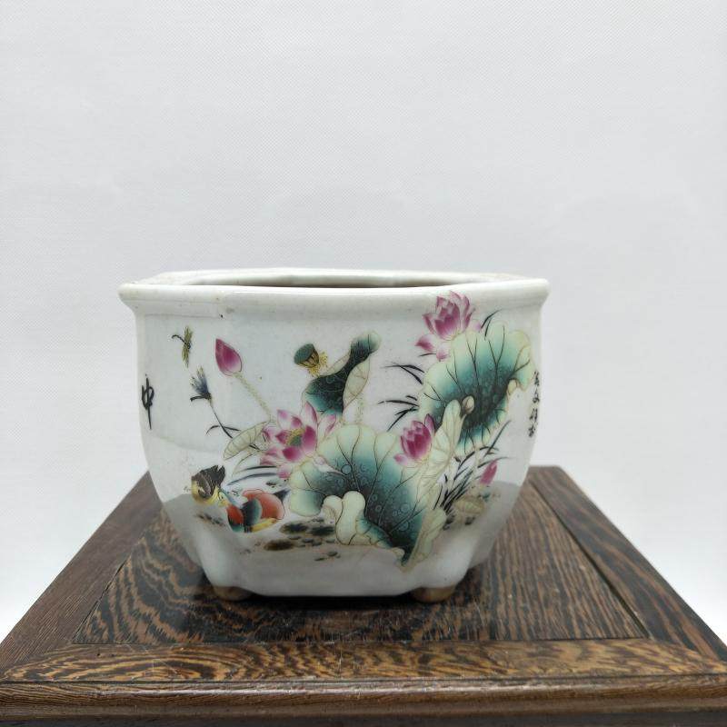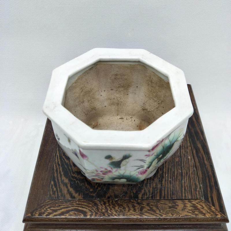民國粉彩荷花鴛鴦八方花盆 古董老陶瓷舊貨古玩瓷器老貨擺件收藏1入