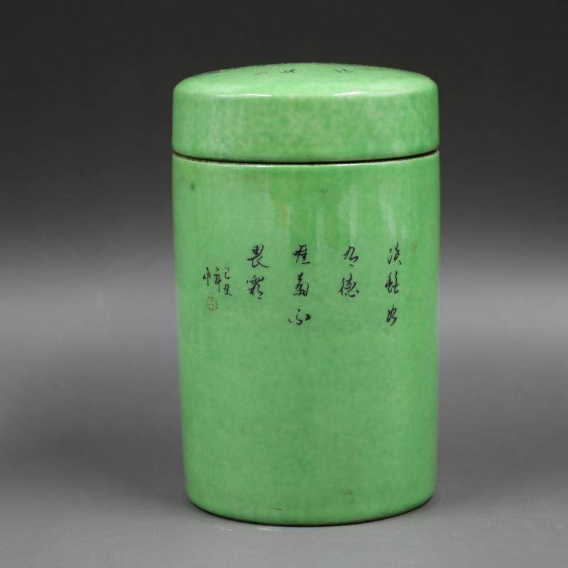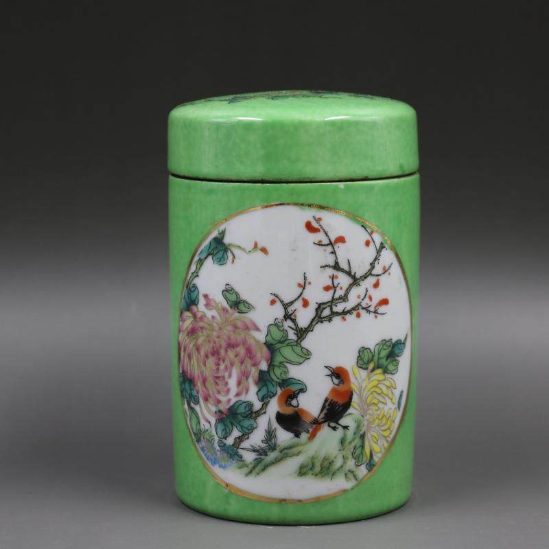 民國綠地粉彩花鳥茶葉罐仿古瓷器擺件老胎民間收藏古董古玩擺件1入