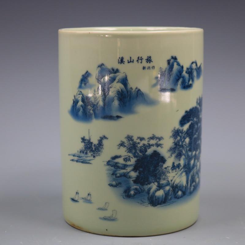 清同治青花人物山水紋筆筒民間收藏文房用品擺件古董古玩老貨瓷器1入