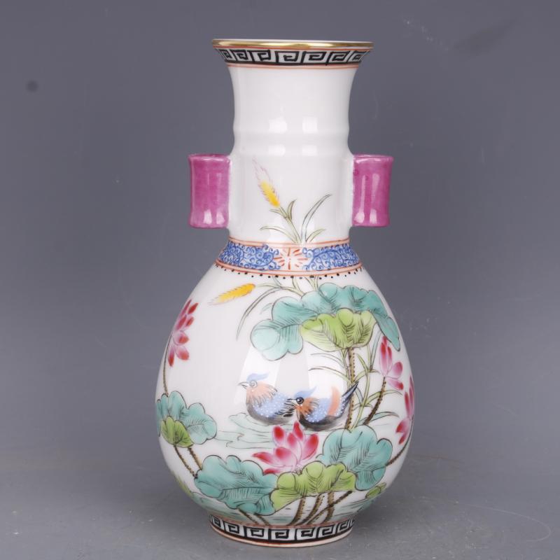 清雍正描金粉彩荷花花鳥插花瓶仿古工藝瓷器家居中式擺件古玩收藏1入
