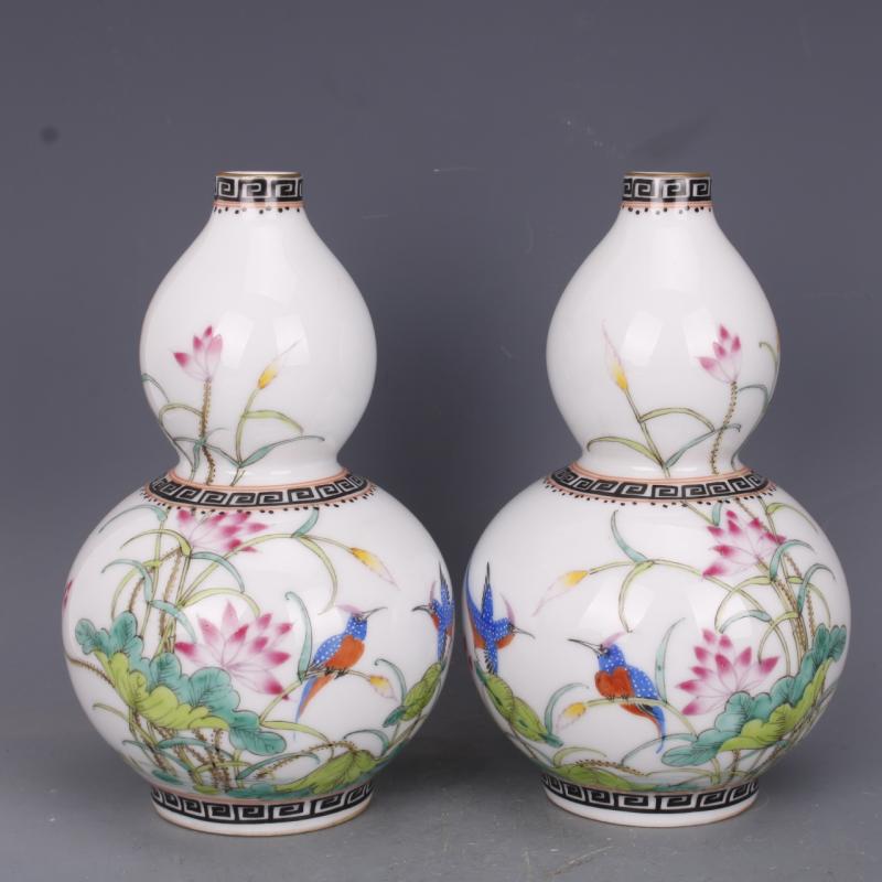 清雍正描金粉彩荷花花鳥葫蘆瓶一對仿古工藝瓷器家居擺件古玩收藏1入