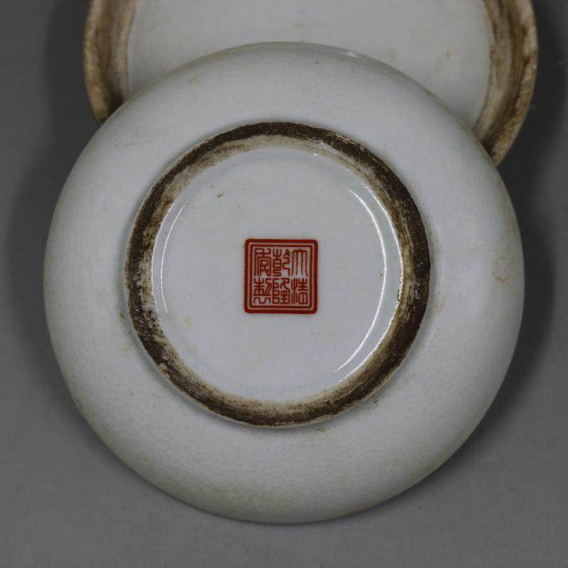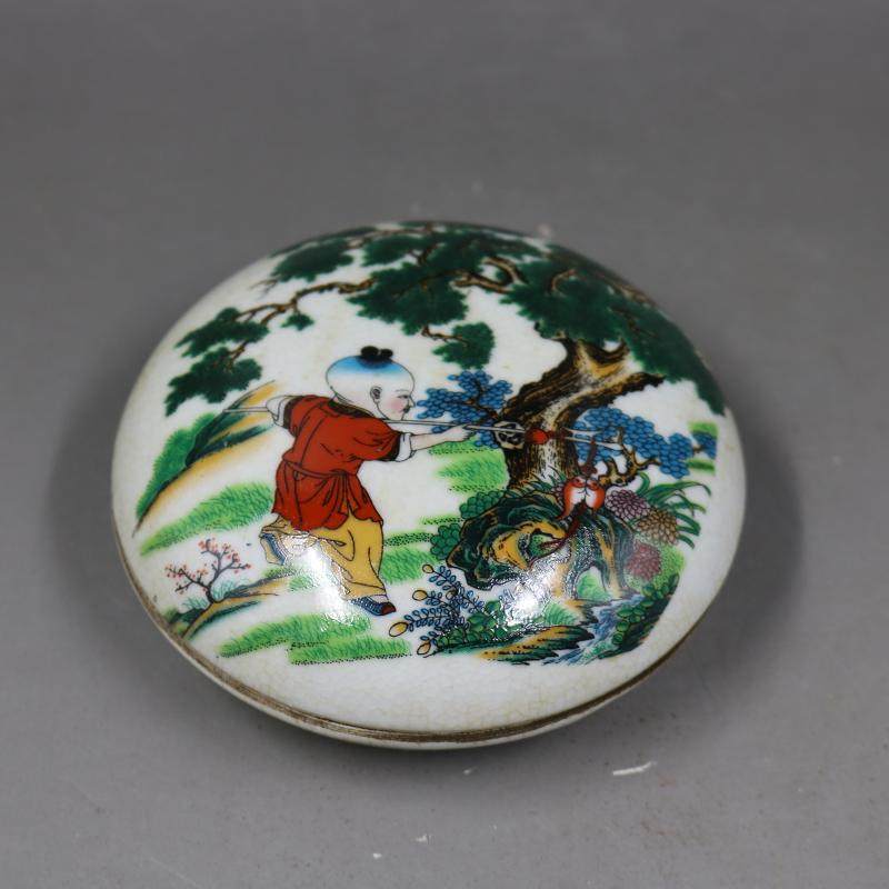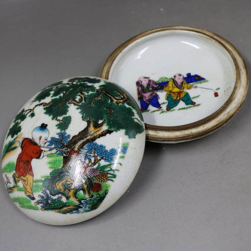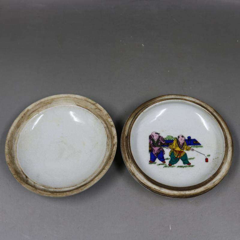 民國粉彩嬰戲紋印泥盒仿古老貨瓷器家居文房裝飾擺件古董古玩收藏1入