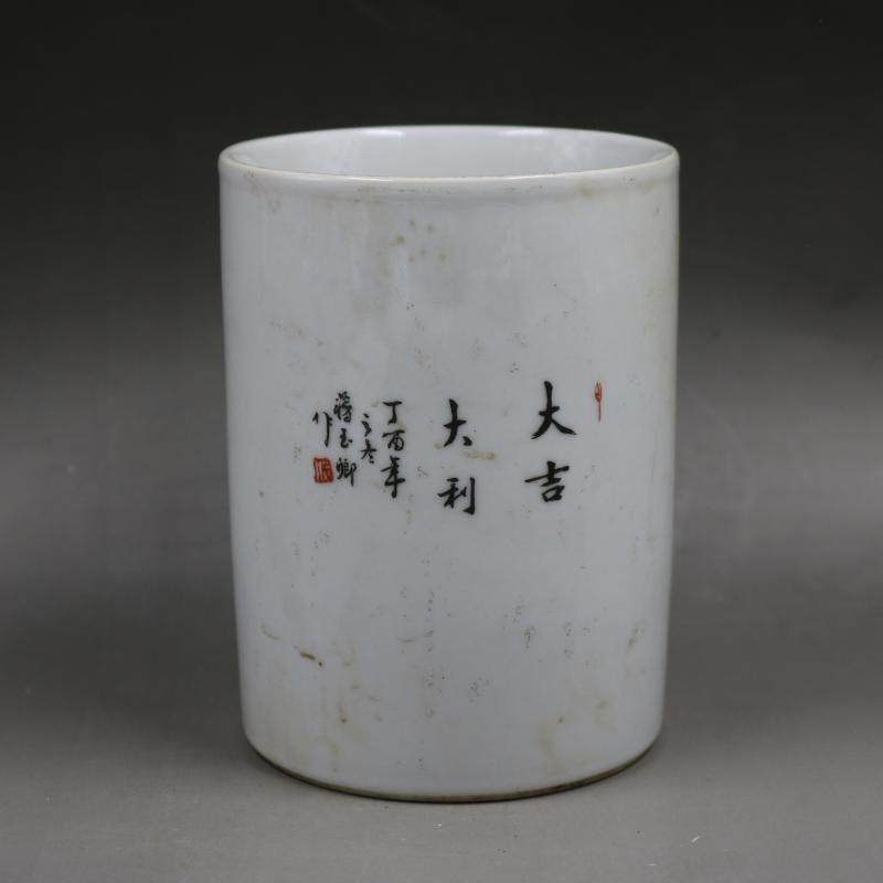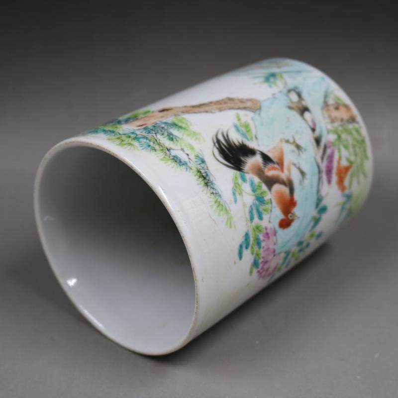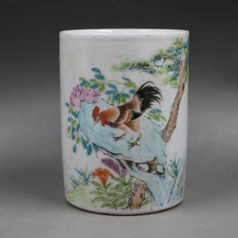 民國江西瓷業公司款粉彩公雞紋筆筒仿古文房裝飾擺件瓷器古董古玩1入