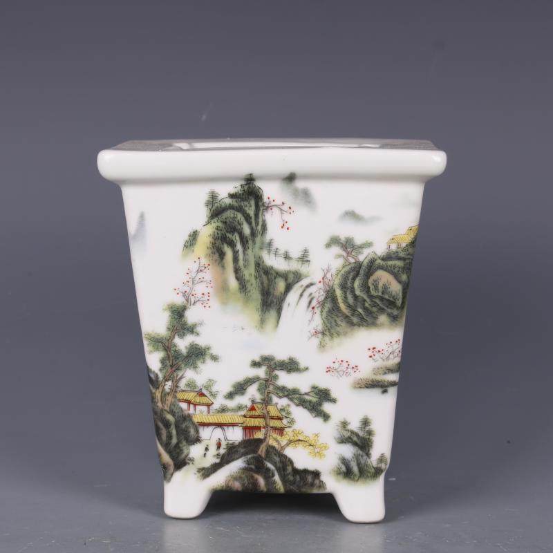 民國粉彩山水花鳥四方花盆民間收藏家居花卉擺件仿古瓷器古董古玩1入
