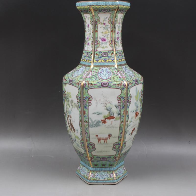 [3]大清乾隆年制描金琺瑯彩十二生肖六方瓶家居觀賞仿古瓷器古玩擺件1入