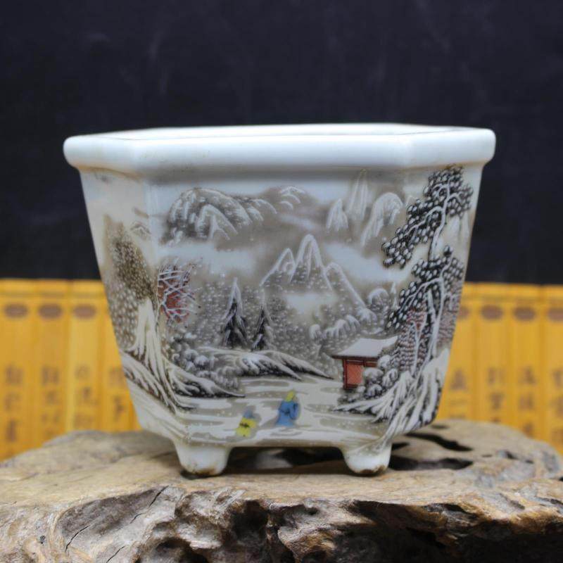 民國淺降彩雪景六方花盆 家居擺件仿古小花盆 古董古玩收藏1入