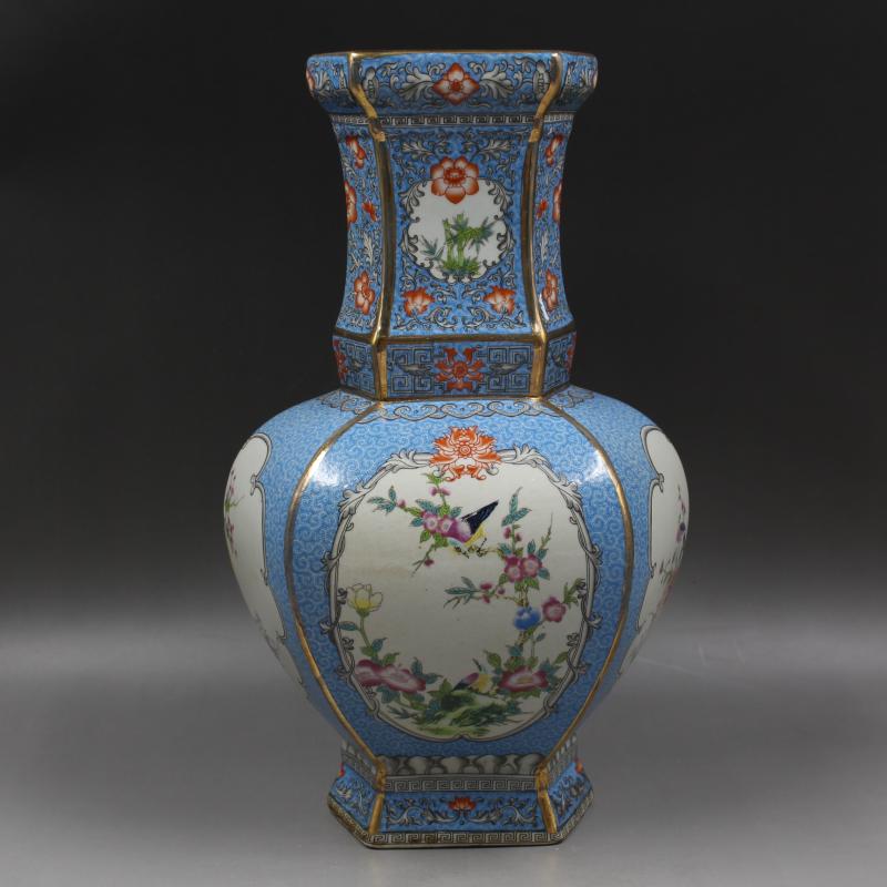 大清乾隆年制描金琺瑯彩花鳥六方瓶仿古觀賞瓷器擺件古董古玩收藏1入