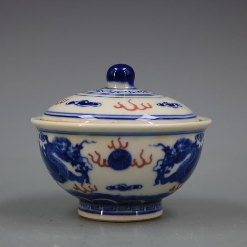 清康熙青花釉里紅雙龍戲珠蓋碗手繪仿古瓷器家居擺件古董古玩收藏1入