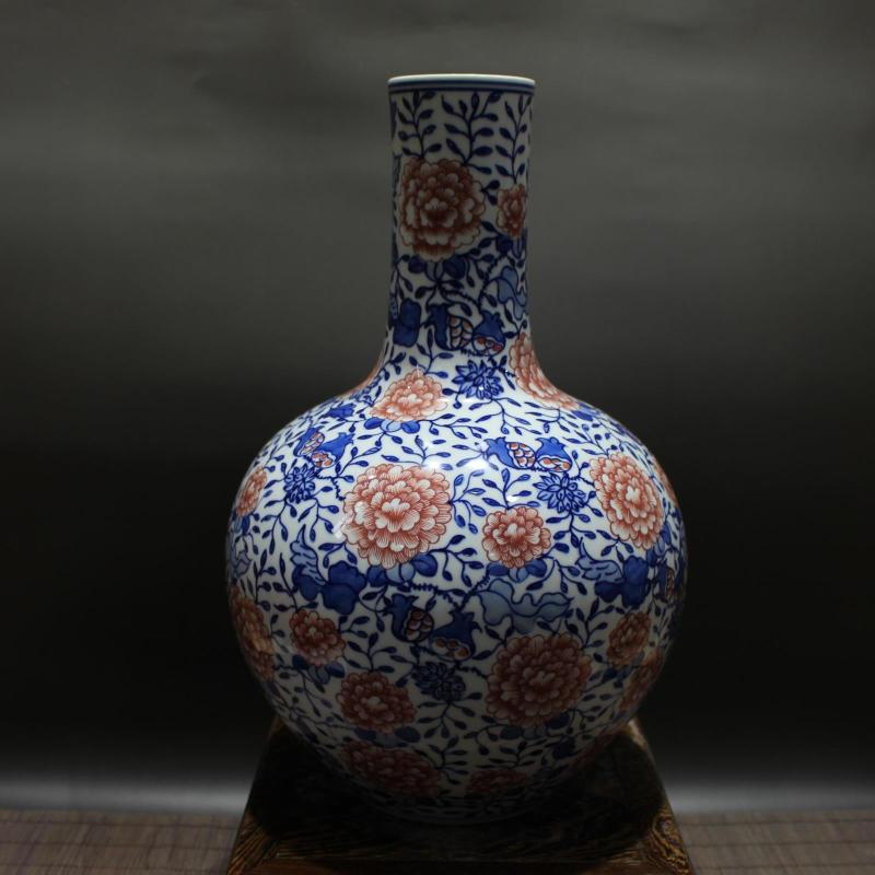 清乾隆景德鎮民仿官窯青花釉里紅萬花天球瓶手工家居擺件瓷器收藏1入