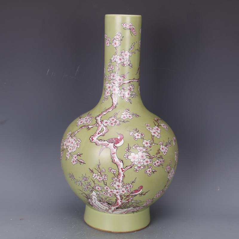 清康熙綠地紅彩喜上眉梢花鳥天球瓶仿古中式瓷器擺件古董古玩收藏1入
