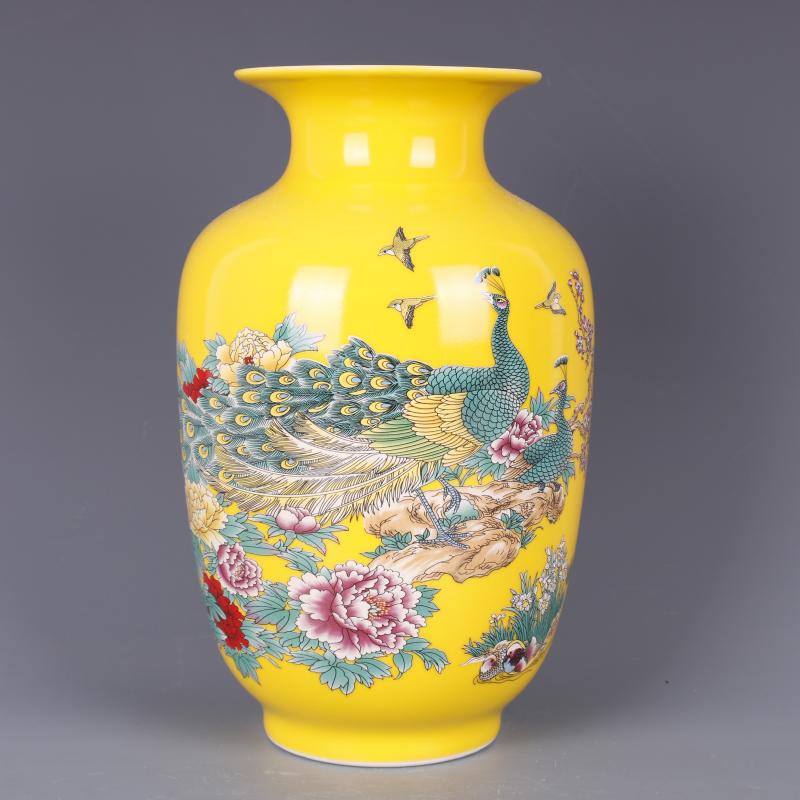 清乾隆黃地粉彩孔雀牡丹冬瓜瓶仿古中式家居餐廳瓷器擺件古董古玩1入