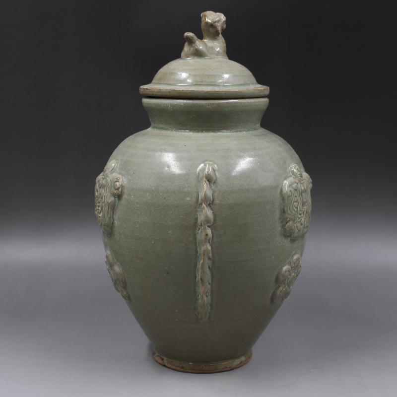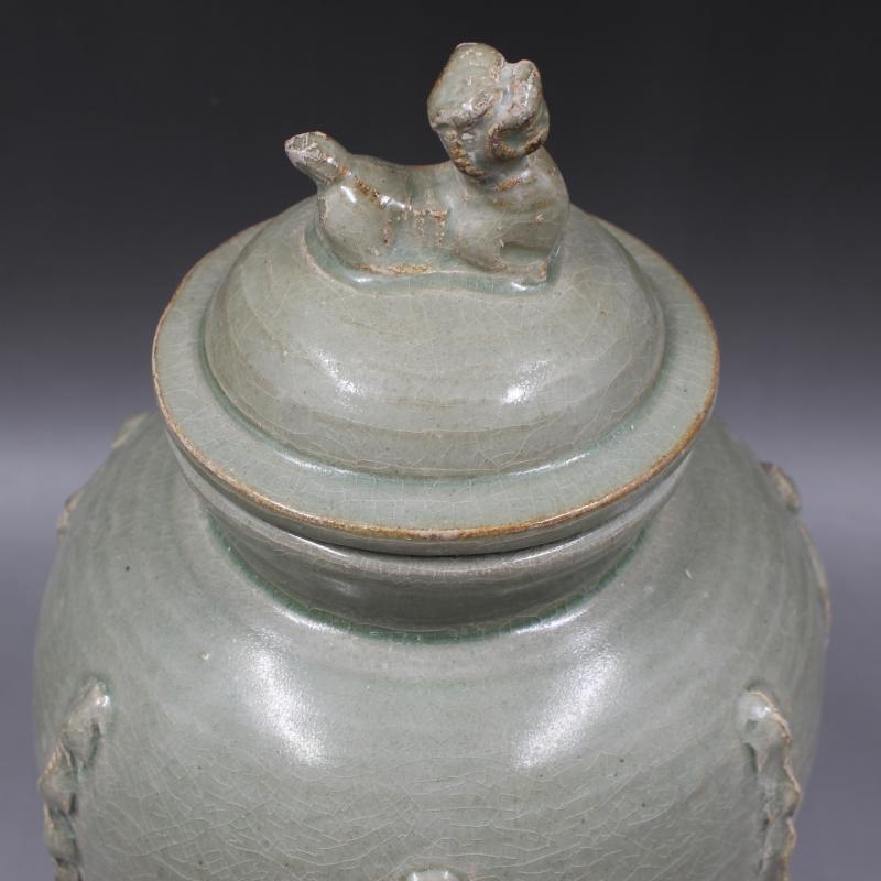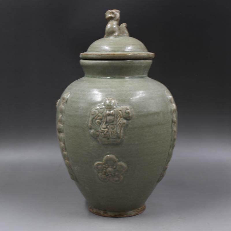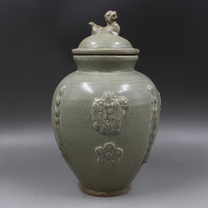 西晉越窯浮雕刻人物狗頭罐 全手工仿古老貨瓷器擺件 古董古玩收藏1入