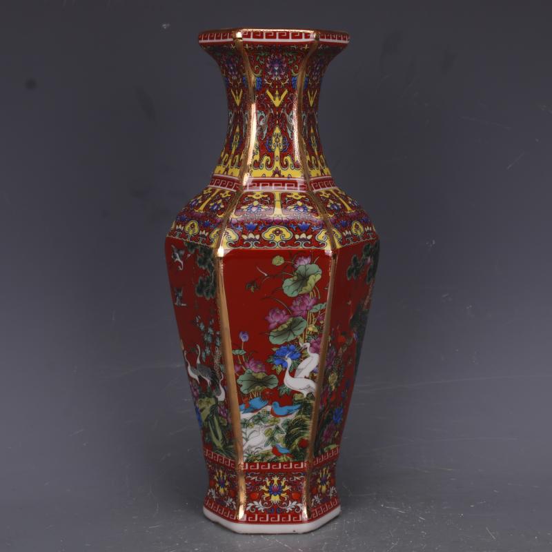 清乾隆琺瑯彩花鳥六方花瓶仿古工藝品瓷器家居中式擺件古董古玩1入
