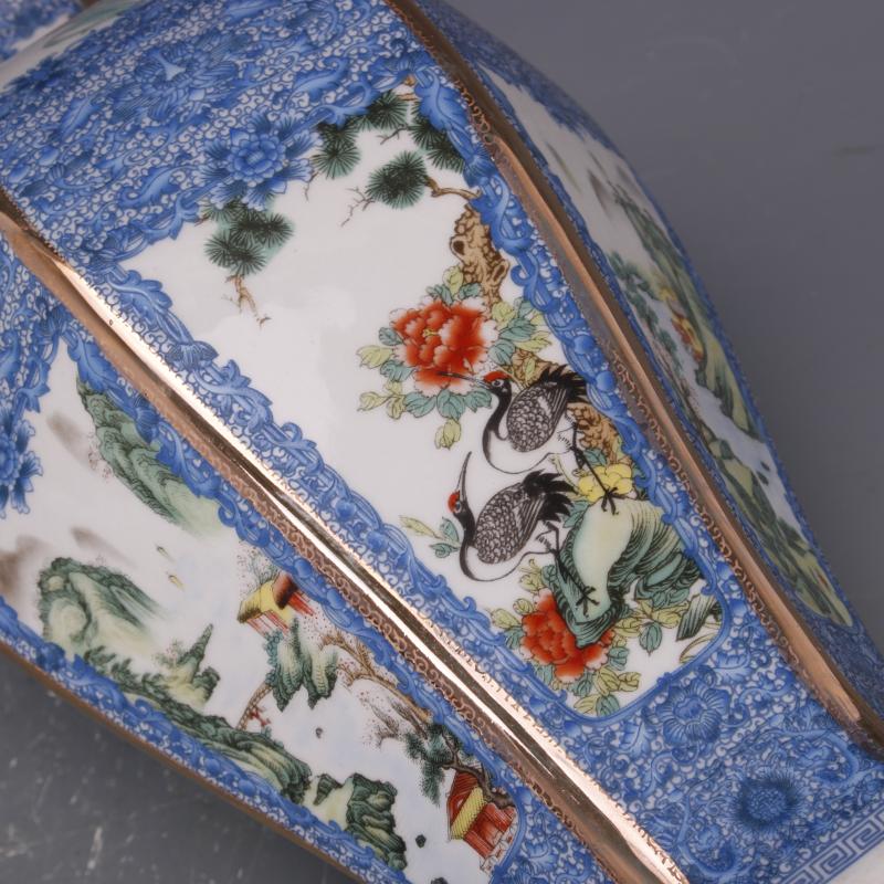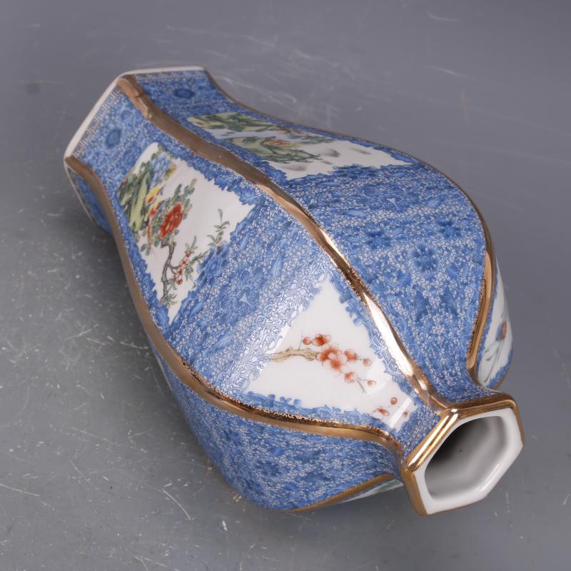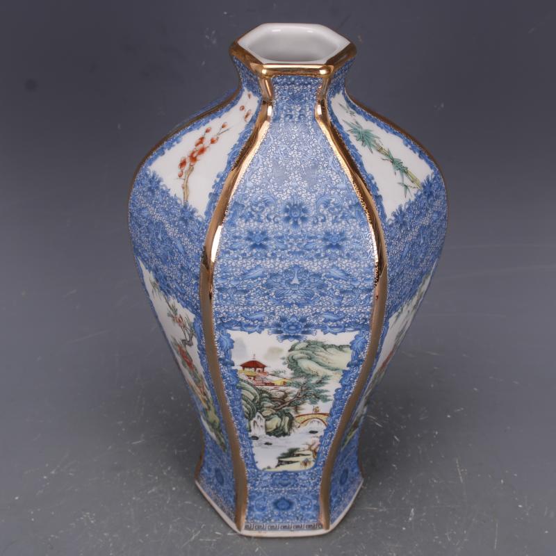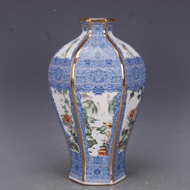 清乾隆描金琺瑯彩山水花鳥六方梅瓶仿古瓷器中式家居擺件古玩收藏1入