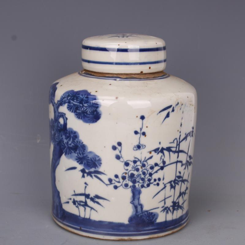 清光緒青花松竹梅紋茶葉罐仿古老貨瓷器家居中式擺件古董古玩收藏1入
