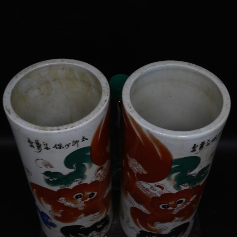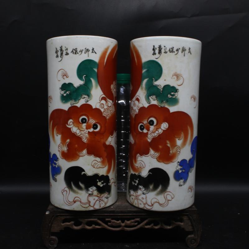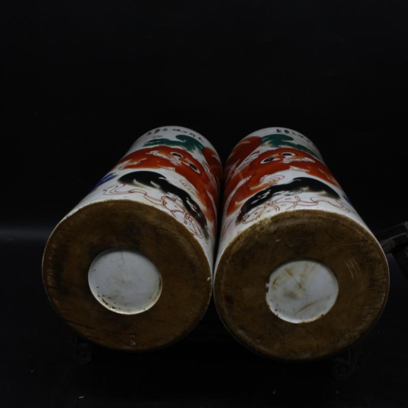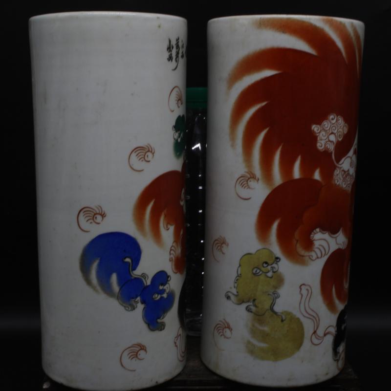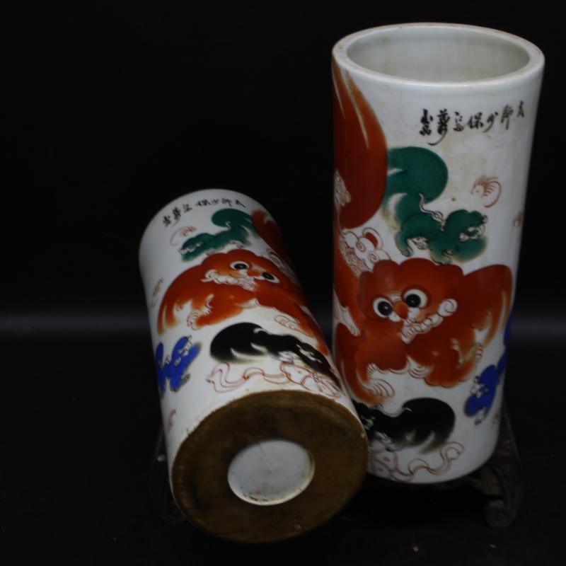 清同治年制手工手繪麒麟帽筒 仿古瓷器 老古董古玩擺件1入
