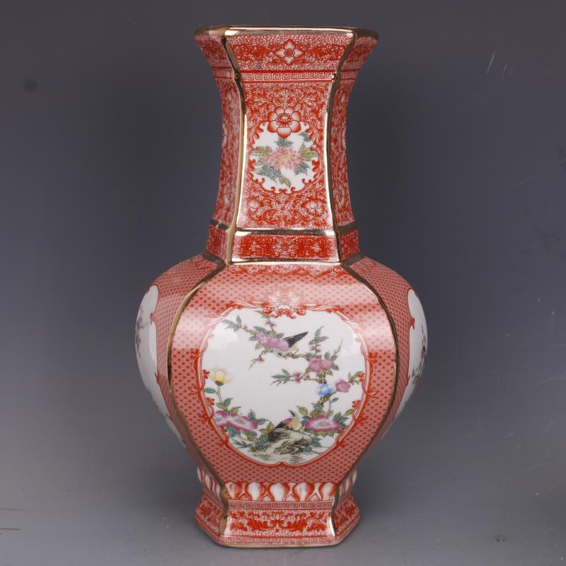 清乾隆描金琺瑯彩花鳥六方賞瓶仿古瓷器家居中式擺件古董古玩收藏1入