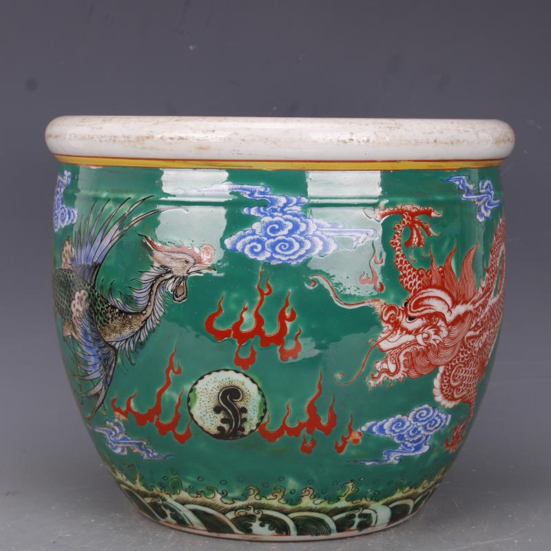 清康熙綠地粉彩龍鳳紋缸香爐仿古老貨瓷器家居中式擺件古玩收藏1入