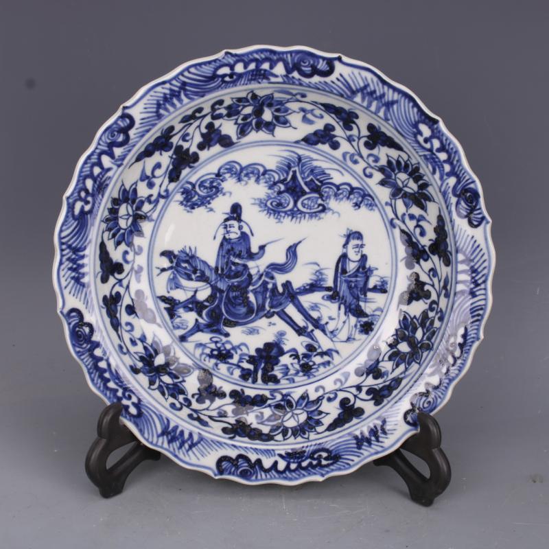 [2]明宣德青花人物葵口盤手繪仿古老貨瓷器家居中式擺件古董古玩收藏1入
