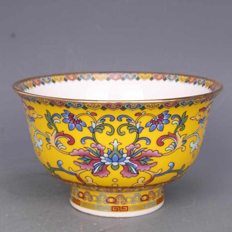 5寸黃地粉彩纏枝花紋碗仿古工藝品瓷器家居中式餐具古董古玩擺件1入