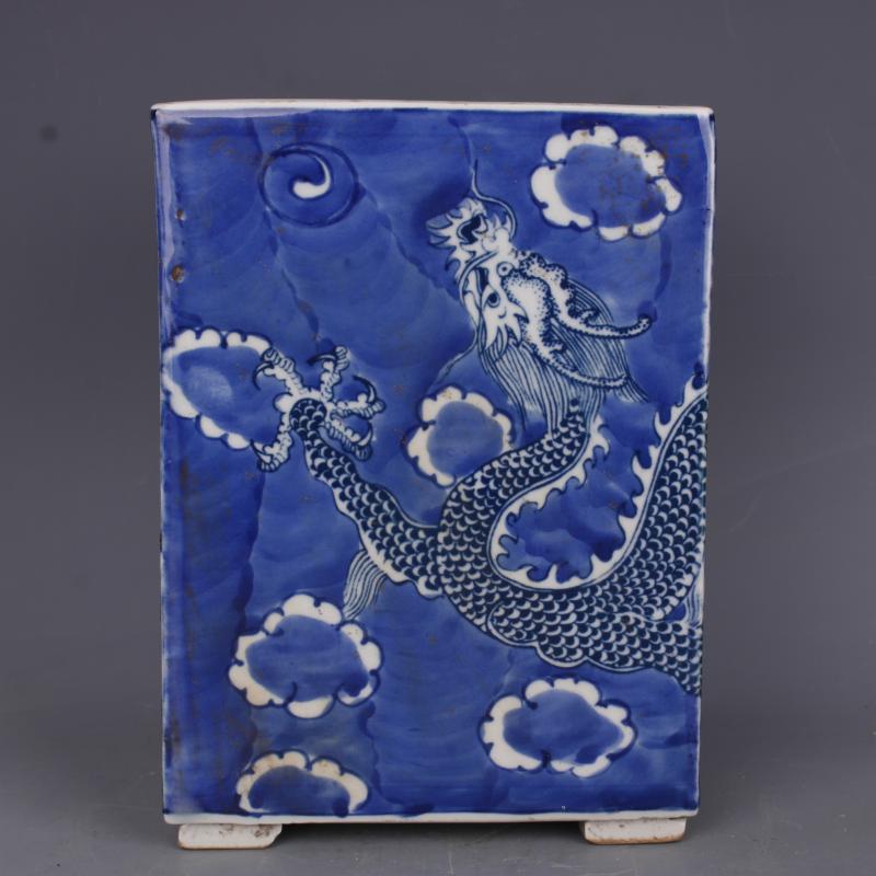清康熙藍地青花穿花龍紋四方筆筒手繪仿古老貨瓷器家居文房擺件1入