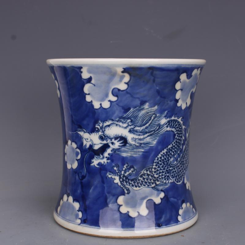清康熙青花穿花龍紋紋筆筒手繪仿古瓷器家居中式擺件古董古玩收藏1入