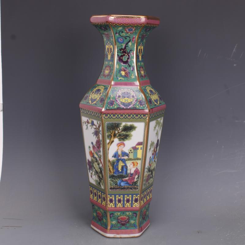 清乾隆描金琺瑯彩西洋人物花鳥六方瓶仿古瓷器家居擺件古董古玩1入