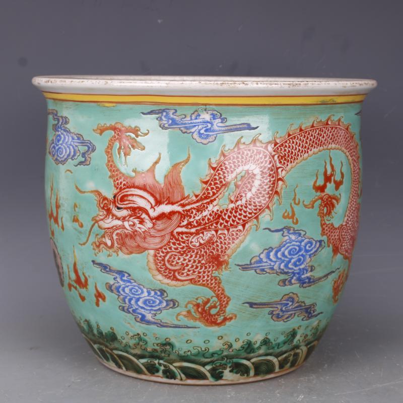 清康熙綠地粉彩龍鳳紋缸香爐仿古老貨瓷器家居中式擺件古玩收藏1入