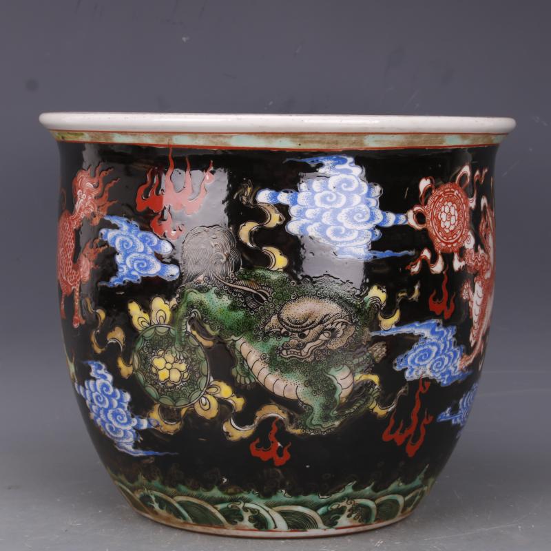 清康熙黑地粉彩麒麟獅子紋缸仿古老貨瓷器家居中式擺件古玩收藏1入