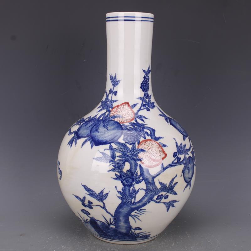 清乾隆青花釉里紅福壽九桃紋天球瓶仿古老貨瓷器家居中式擺件古玩1入