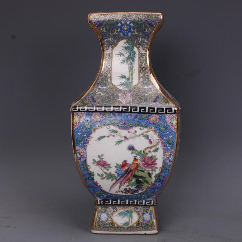 清乾隆描金琺瑯彩花鳥四方瓶仿古工藝品瓷器家居中式擺件古玩收藏1入