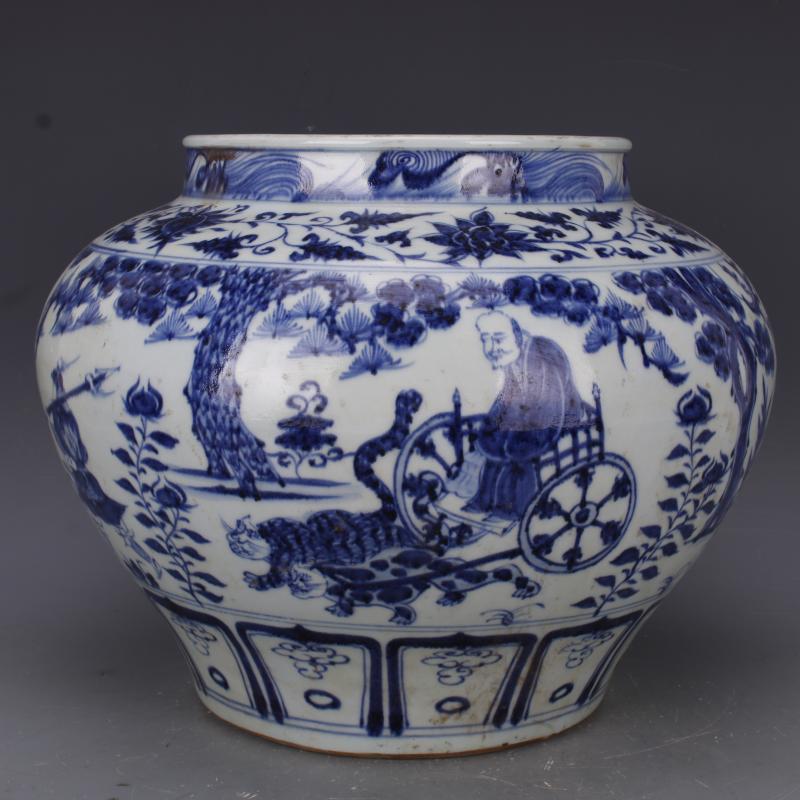 元青花人物鬼谷子下山圖紋罐手繪仿古老貨瓷器家居中式古玩擺件1入