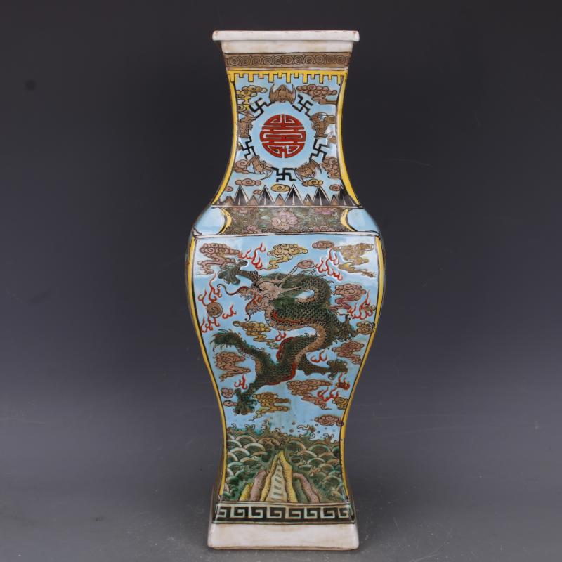 清康熙藍地粉彩龍鳳紋四方瓶仿古老貨瓷器家居中式擺件古董收藏1入