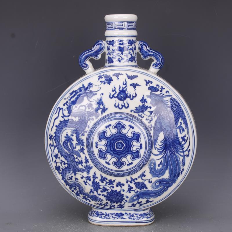 清乾隆青花穿花龍鳳紋抱月扁瓶手繪仿古工藝瓷器家居中式古玩擺件1入
