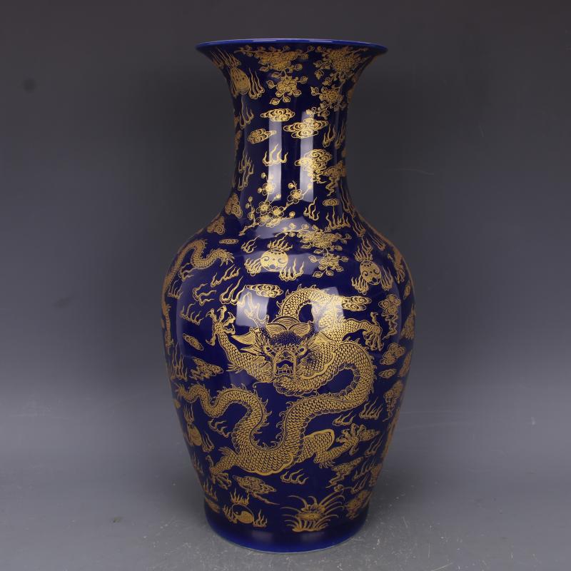清康熙祭藍地描金穿花云龍紋冬瓜瓶仿古瓷器中式家居擺件古玩收藏1入