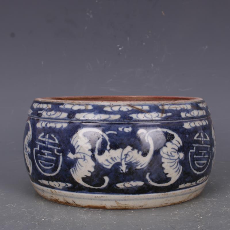 清康熙藍地青花留白福壽紋硯臺手工仿古老貨瓷器家居文房古玩擺件1入