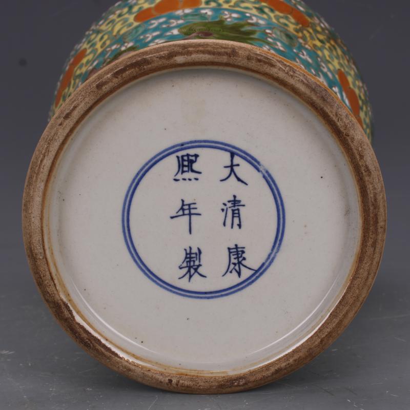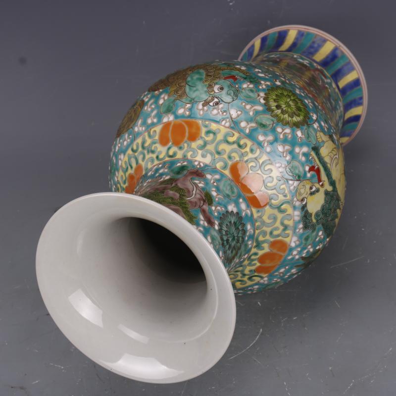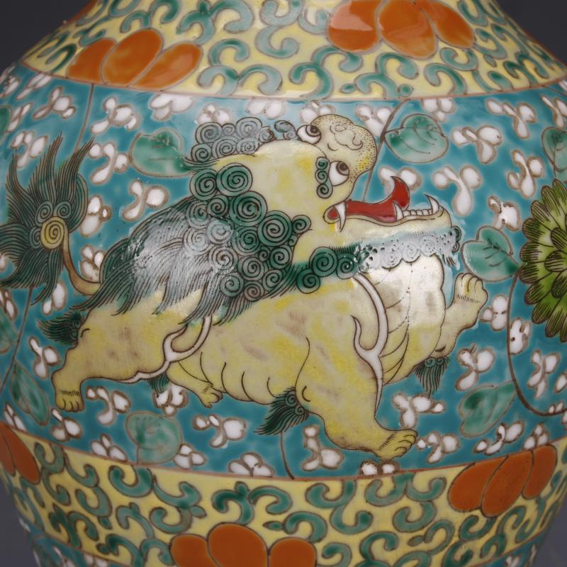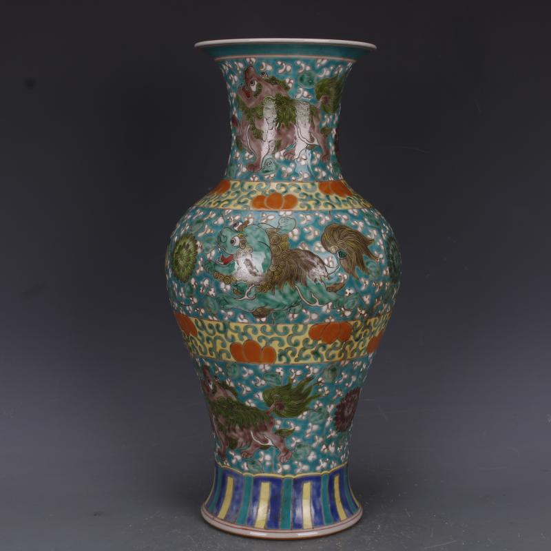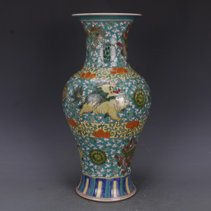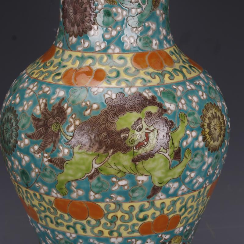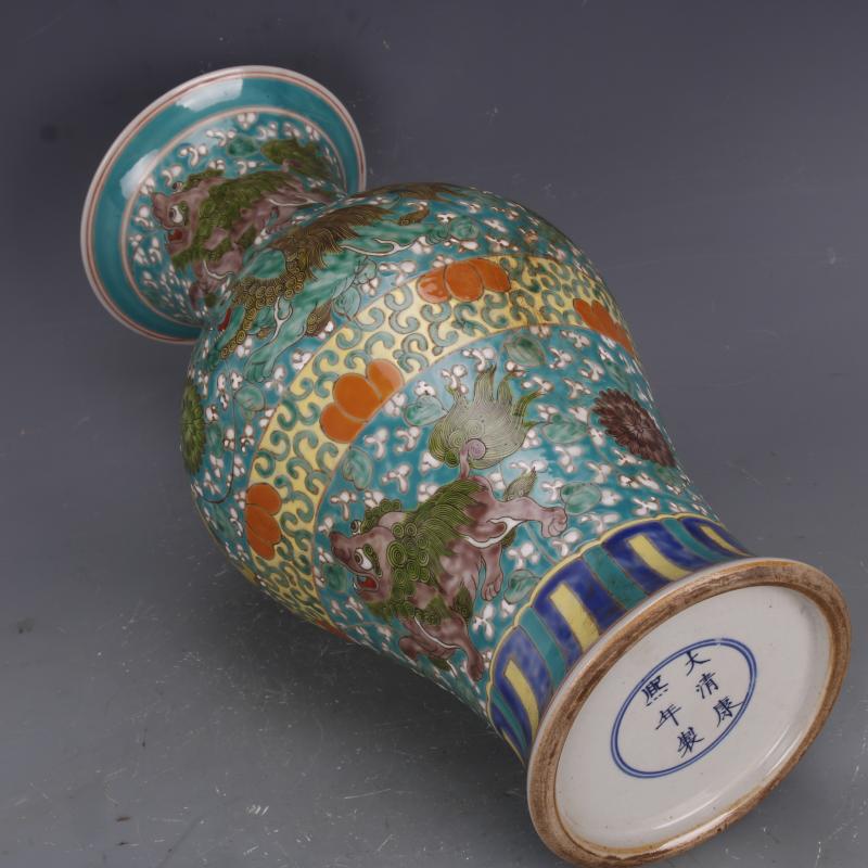 清康熙綠地穿花獅子紋魚尾瓶仿古老貨瓷器家居擺件古董古玩收藏1入